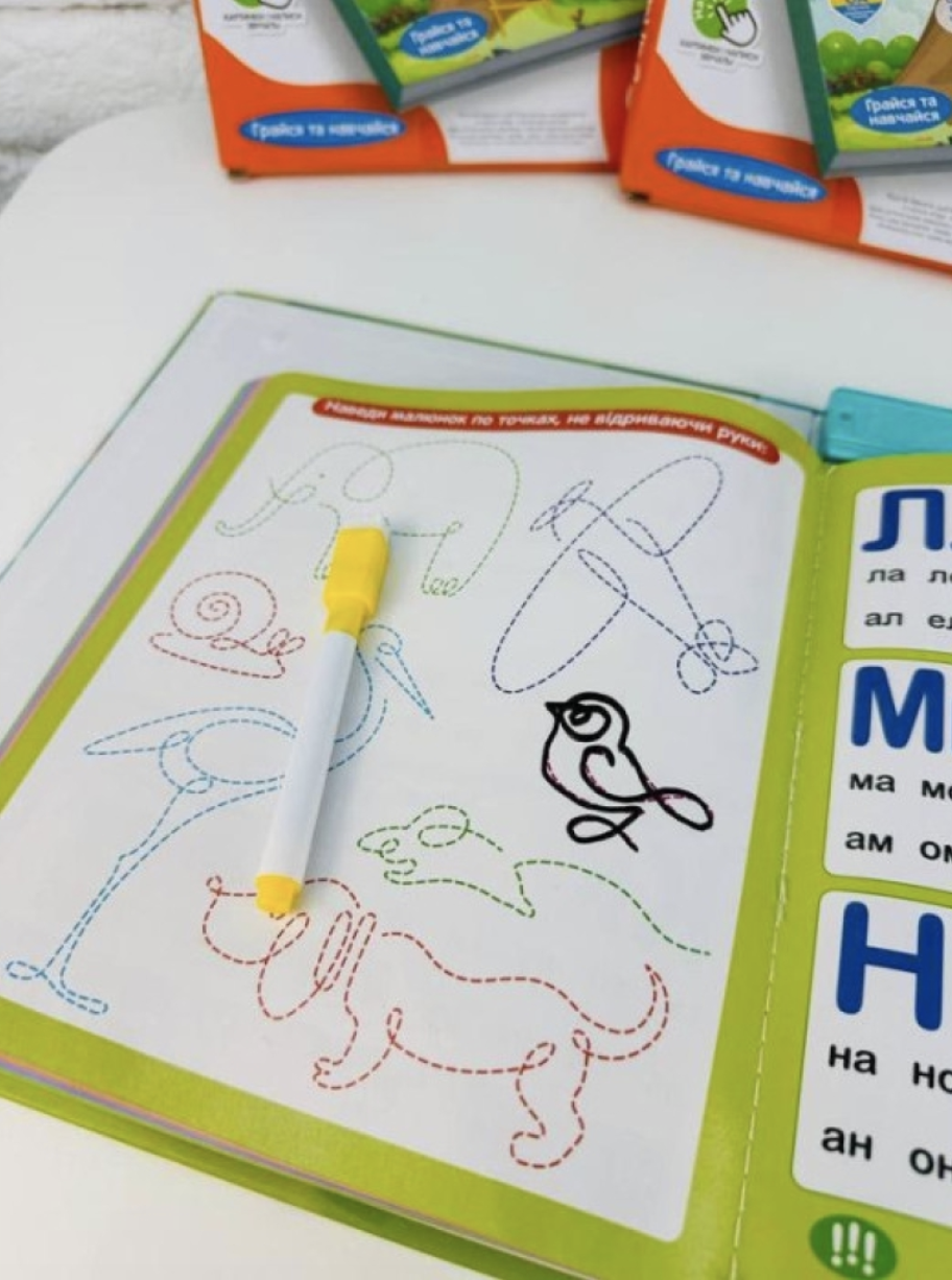 Функція “Пиши/стирай” – дає змогу малювати та писати на сторінках книжки за допомогою спеціального маркера, який легко стирається. Це зручно для багаторазового використання та повторення навчального матеріалу.
