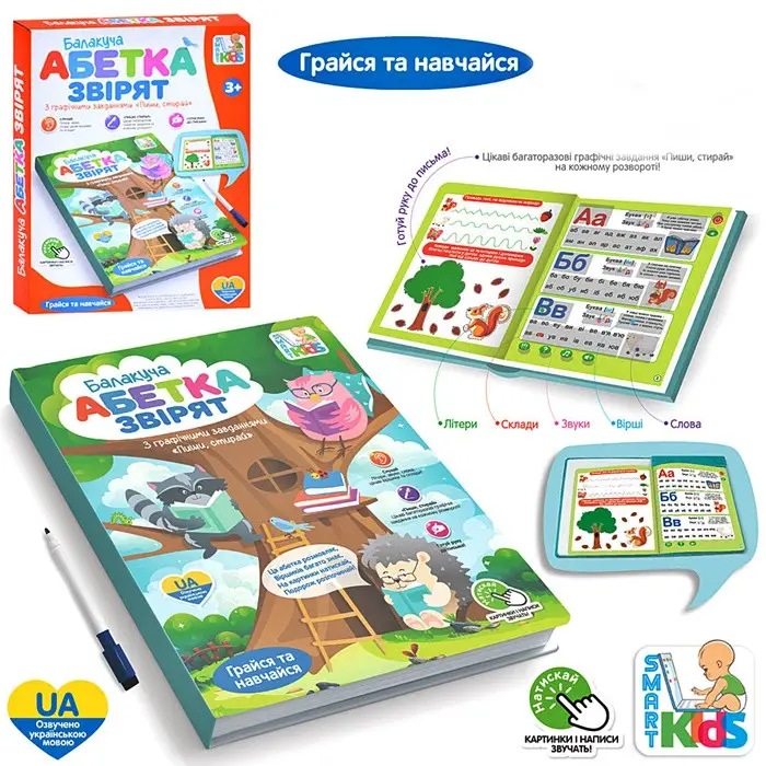 Дитяча навчальна книжка - це ідеальний компаньйон для навчання малюка. Вона не лише розмовляє, а й пропонує різноманітні активності, віршики, графічні завдання та пісні.